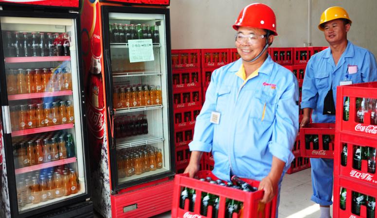 圖為生產(chǎn)員工工作間隙領(lǐng)取冰鎮(zhèn)汽水