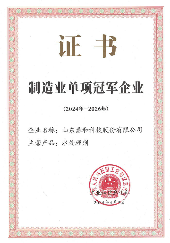 近日,泰和科技領到了國家工業(yè)和信息化部頒發(fā)的“制造業(yè)單項冠軍企業(yè)”證書,代表公司順利通過了復核。該稱號的延續(xù)不僅體現(xiàn)了泰和科技在水處理劑制造領域的卓越實力,也充分展示了公司在市場份額、創(chuàng)新能力、質量水平、品牌影響力等方面的顯著優(yōu)勢。